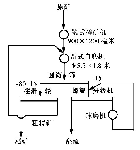生產(chǎn)初期采用兩毆全閉路半自磨流程醫(yī)圖1(a)。原礦粗碎至350~0毫米,給入濕式自磨機(jī)磨碎,自磨機(jī)與高堰式螺旋分級(jí)機(jī)由泥勺機(jī)提升組成閉路。自磨機(jī)排礦經(jīng)圓筒篩過篩后,+10毫米物料返回自磨機(jī),篩下物料進(jìn)螺旋分級(jí)機(jī)分級(jí),返砂也返回自磨機(jī),分級(jí)溢流細(xì)度為50%~200目左右。分級(jí)溢流經(jīng)一段磁力脫水槽脫泥、脫水,并廢棄部分尾礦后,進(jìn)入第二段磨礦。第二段磨礦為溢流型球磨機(jī)與螺旋分級(jí)機(jī)組成的預(yù)檢分級(jí)磨礦回路,分級(jí)溢流細(xì)度為80%~200目,合格溢流進(jìn)磁選選別。兩段閉路自磨流程的主要問題是,兩段磨礦的負(fù)荷不平衡,往往第一段負(fù)荷高,第二段負(fù)荷不足,而且難以調(diào)節(jié);同時(shí),自磨機(jī)中易形成難磨粒級(jí)的聚集,致使自磨機(jī)的產(chǎn)量提不高,若加大給礦量,則自磨機(jī)造成“脹肚”。針對上述存在問題,將原流程改為兩段一開路,如圖1(b)。第一段自磨機(jī)開路工作,圓筒篩篩孔改為5毫米,取消了螺旋分級(jí)機(jī),篩上產(chǎn)物不再返回自磨機(jī),而給入第二段球磨機(jī)磨碎,篩下產(chǎn)物直接進(jìn)磁力脫水槽和第二磨礦段。自磨機(jī)開路工作后提高了處理能力,第二段磨礦的負(fù)荷也得到提高,兩段磨礦的負(fù)荷趨于平衡。例:某鐵礦兩段半閉路半自磨流程。如圖2所示。