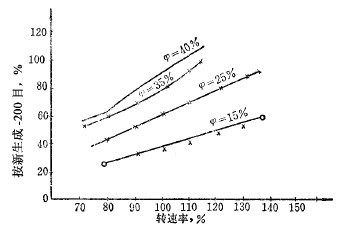 超臨界轉速運轉不僅在理論上突破了公式(2-5)的局限性,而且可以提高磨機的處理能力。生產實踐指出,如果應用恰當,超臨界轉速運轉可以提高磨機的生產力,雖然功率耗相應地增加,但比功率耗(即千瓦·時/噸)常常是降低的,如下表中的例子。磨機的轉速和裝球量是影響磨機生產率的兩個關鍵性的因素。超過nc值運轉固然可以提高磨機生產率,但要求減少裝球量,而減少裝球量又會使生產率降低。所以不能片面地采用大幅度提高轉速及大幅度減少裝球量的辦法,這反而會使生產率下降,如下圖3-2-6反映的情況。當裝球率減少到25%以下,即使將轉速率提高到145%,生產率也達不到裝球率為35~40%,(轉速率為110~120%的。并且轉速太高,磨機振動很厲害,也會造成危險。