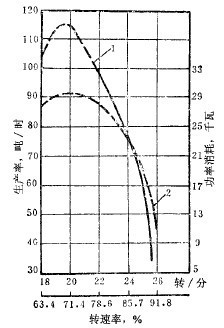 于71~75%范圍內磨機的處理能力更高,轉速率低于或高于這個范圍時處理能力便趨于降低。磨機輸入功率與轉速率的關系和生產率與轉速率的關系相似,按磨碎每噸產品的動力消耗計,則一般隨轉速率降低而減少。