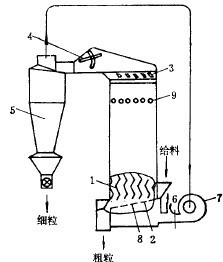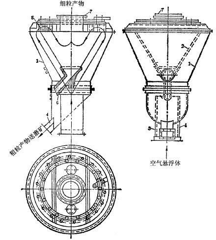圖2所示的上升氣流風(fēng)力分級機(jī)(附旋風(fēng)集塵器),呈方形的分級室內(nèi),裝有若干近于平行的豎直“之”字形導(dǎo)板1。從料斗給到篩板2上的物料,在下部供入的上升氣流作用下,被帶到分級室中,經(jīng)過彎曲的導(dǎo)板上行過程中,粗的礦粒落下與未過篩的粗粒一起排出,為粗粒產(chǎn)物。細(xì)的礦粒經(jīng)上部通道入旋風(fēng)集塵器分離,得細(xì)粒產(chǎn)物。集塵器上部排出的氣流,又回到風(fēng)機(jī),循環(huán)使用,或者從孔6中排走。