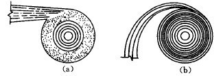 給礦口的大小對處理能力、分離粒度以及分級效率均有一定影響。其直徑常與旋流器直徑呈一定比例,大多dc=(0.08~0.25)D。給礦口的橫斷面形狀以矩形為好。而縱斷面常為圖3-4-19(a)所示的切線形。由于這種進料方式易使礦漿在進入旋流器時與器壁沖擊產生局部旋渦影響分級效率。因此出現了如圖3-4-19(b)的漸開線形及其他型式的給礦管。