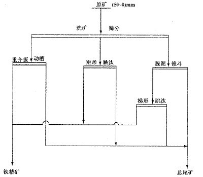 用磁-重聯選,用弱磁選設備優先選出強磁性礦物———磁鐵礦,然后用重選法將赤鐵礦與脈石分開,工藝流程如圖9-1-5,采用該流程所得選礦指標是:當原礦品位29.71%Fe時,可得精礦品位65.10%Fe,回收率71.00%Fe。