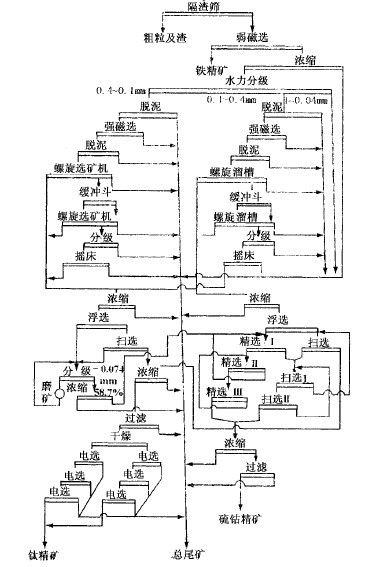 當原礦品位為:46.76%、0.492%Cu、2.112%S、0.021%Co時,可獲得品位為58.1%Fe、回收率89.81%Fe的鐵精礦,品位為18.37%Cu、回收率64.56%Cu的銅精礦,品位為33.25%S及0.24%Co、回收率26.80%Co的硫鈷精礦。