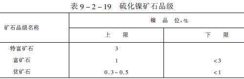 硫化鎳礦石的品級標準列于表9-2-19。