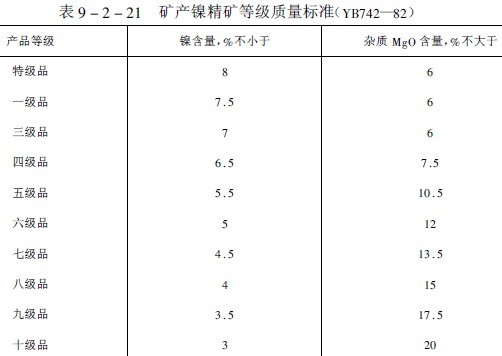 礦產鎳精礦質量標準列于表9-2-21。