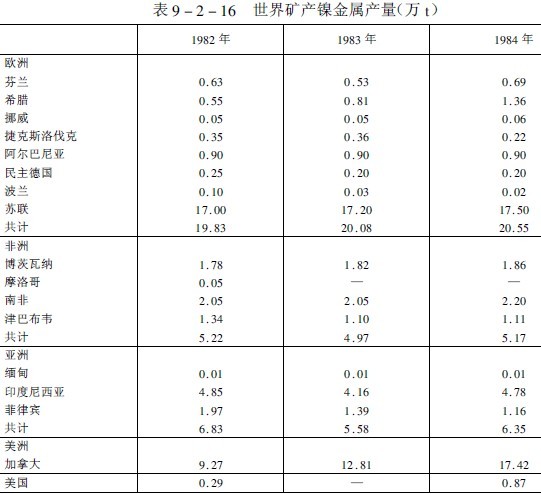 預計,今后全世界的鎳總消耗量將以年平均2%的速度增長,近年來,世界礦產鎳產量和鎳消耗量分別列于表9-2-16和表9-2-17。