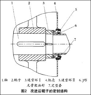 為了解決上述問(wèn)題,對(duì)該密封結(jié)構(gòu)進(jìn)行改進(jìn),采用迷宮密封及J形無(wú)骨架油封結(jié)構(gòu),其結(jié)構(gòu)見(jiàn)圖2。迷宮環(huán)I通過(guò)鍵聯(lián)接安裝在輥?zhàn)虞S上,迷宮環(huán)Ⅱ安裝在機(jī)殼上,這樣迷宮環(huán)I和迷官環(huán)Ⅱ組成了一組迷宮密封。在迷宮環(huán)的外側(cè)還安裝了l副J形無(wú)骨架油封。